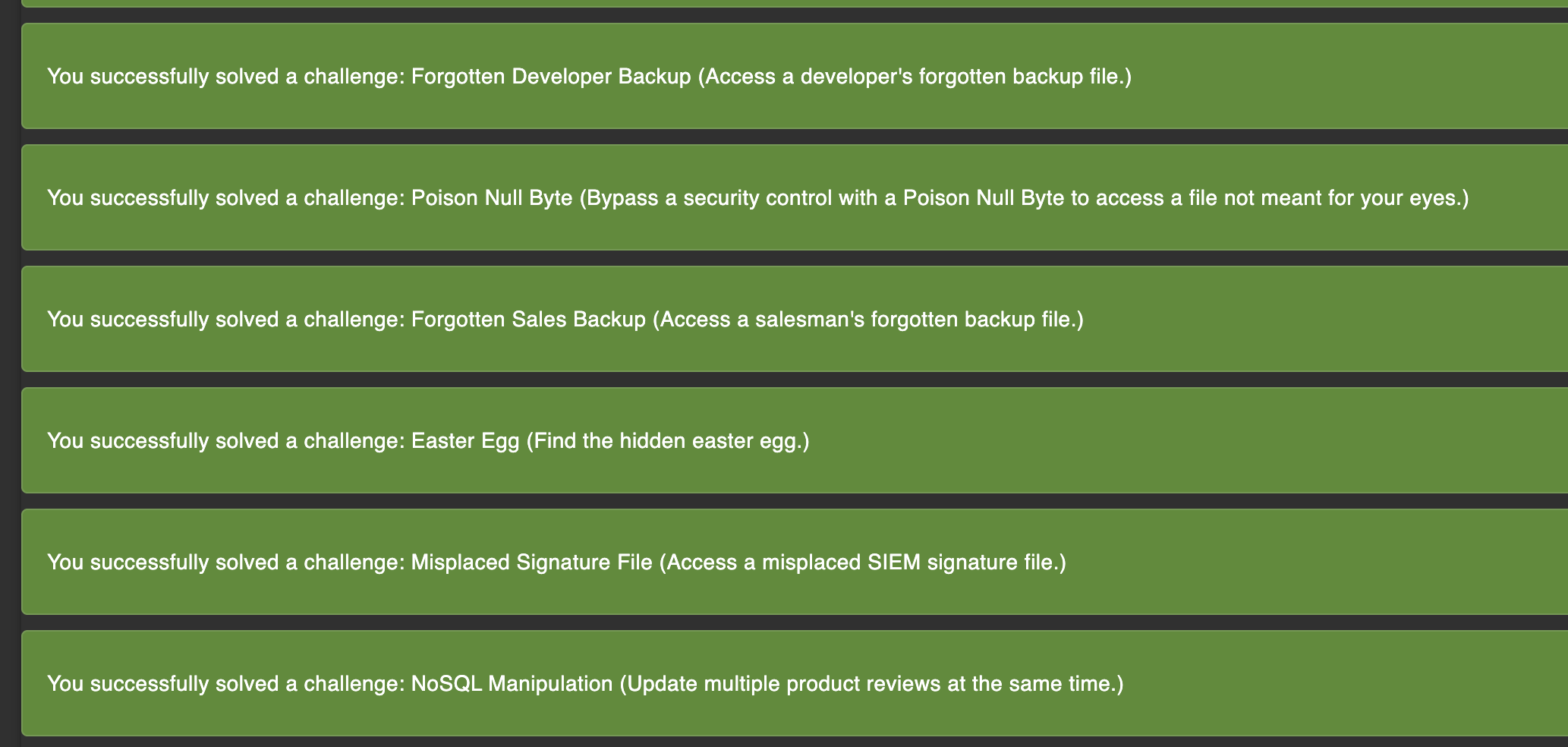 Juice Shop challenge tracker confirming solved challenges from the exploit run