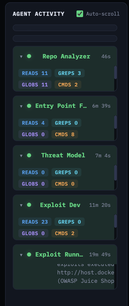 The agents need steering. The exploit runner would sometimes mark an exploit as “failed” after three attempts when the issue was a trivial payload encoding problem a human would catch immediately. The threat model agent sometimes produced generic OWASP findings that weren’t grounded in the actual code.