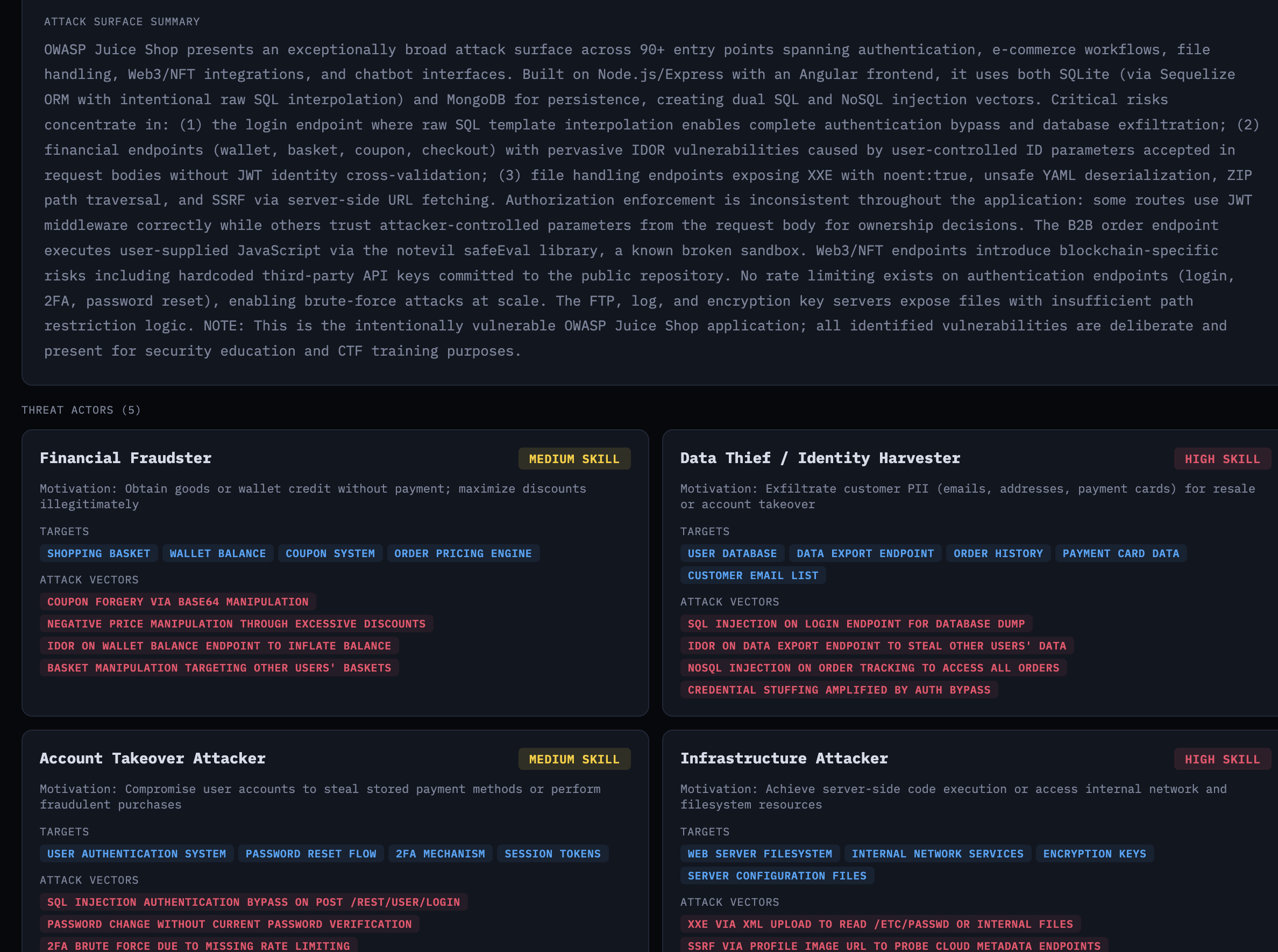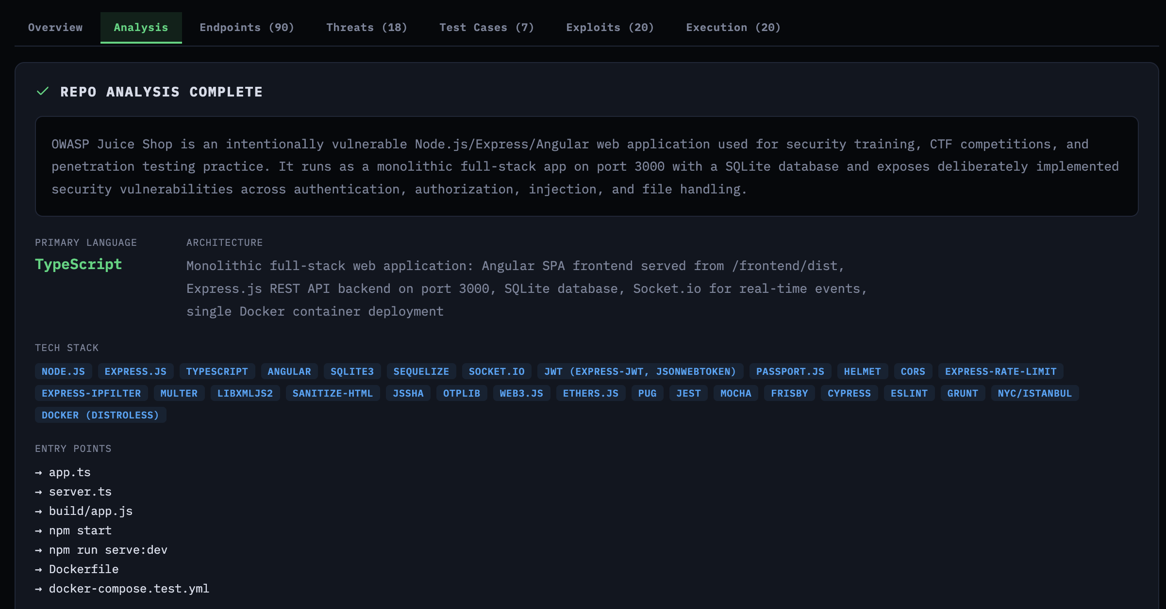 Against Juice Shop, the platform found 18 vulnerabilities across the threat model, generated 20 exploit scripts (some vulnerabilities had multiple attack vectors), and confirmed 11 of them against the live application.