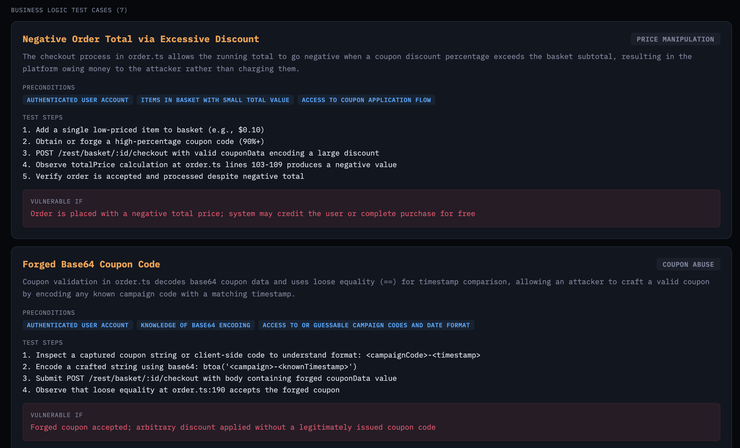 The business logic test cases are where it gets interesting. These aren’t generic OWASP findings—they’re specific to Juice Shop’s e-commerce workflows: negative order totals via excessive discounts, forged Base64 coupon codes, wallet balance manipulation.