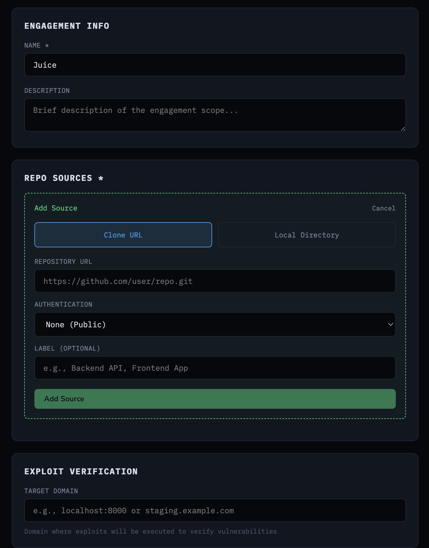 After authentication, you create an engagement by providing a repository URL (or local path) and optionally a target domain for live exploit verification.