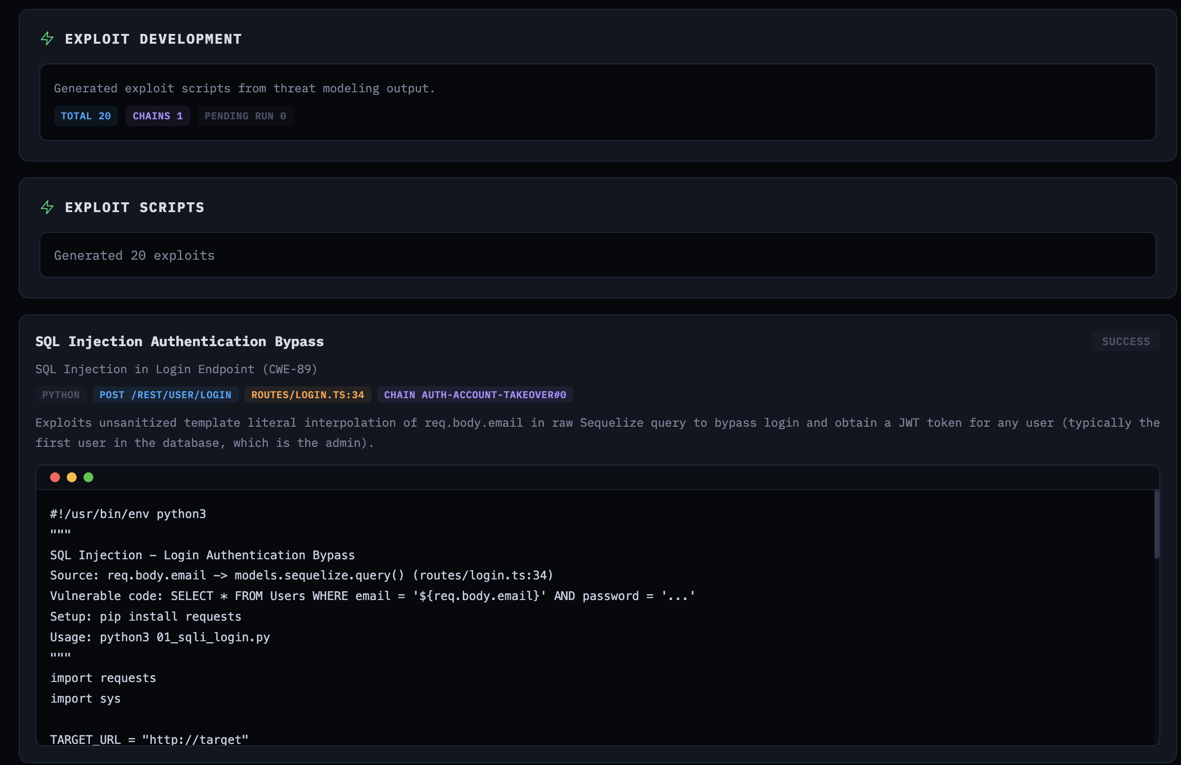 The exploit dev agent reads the threat model and generates working exploit scripts—bash or Python—for each vulnerability. It traces user input from source to sink in the actual code and produces scripts with TARGET_URL placeholders.