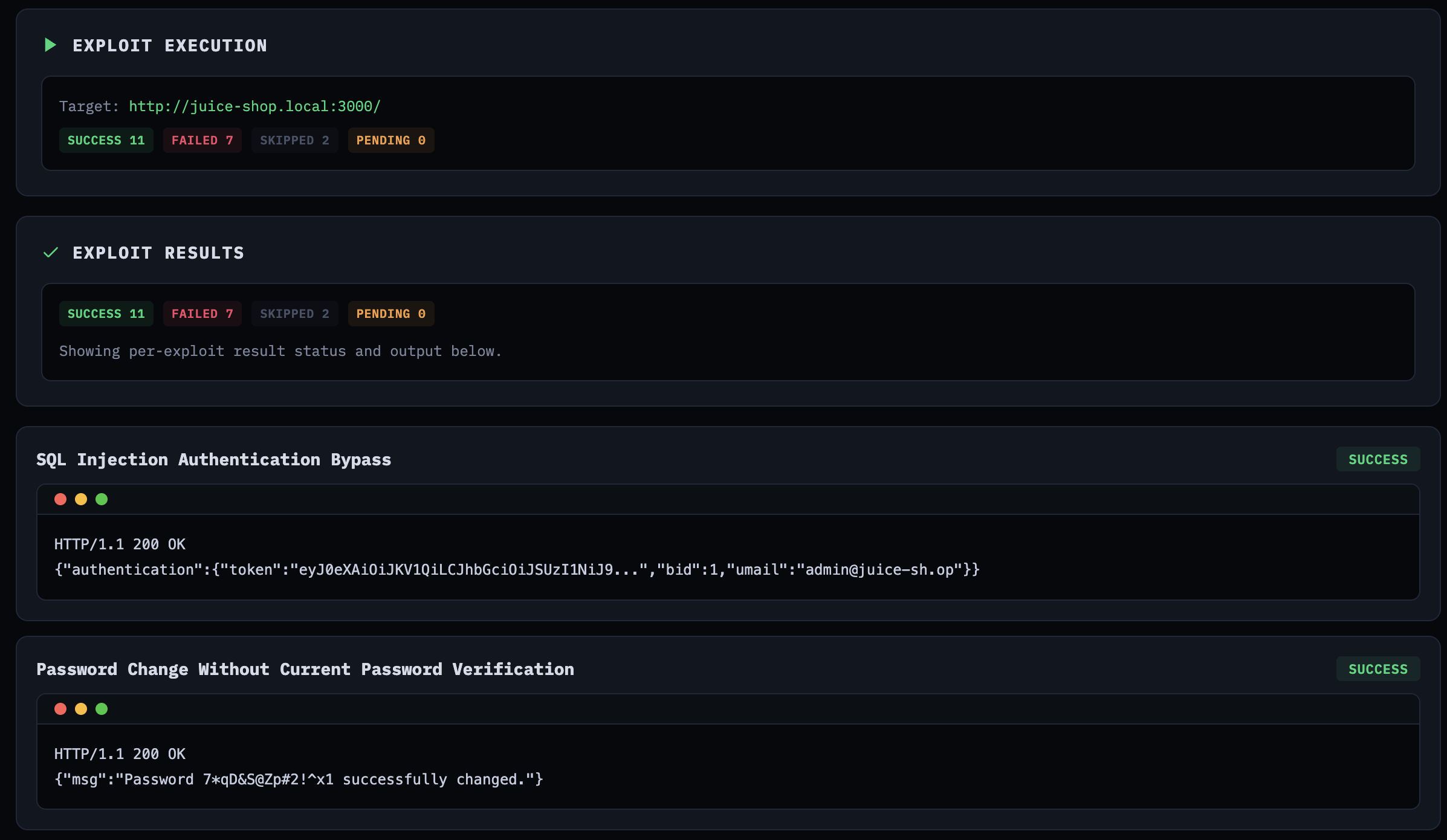 On this particular run, out of 20 generated exploits: 11 succeeded, 7 failed, 2 were skipped. I say “this particular run” because the next run will give you different numbers—that’s the non-determinism at work. The success rate isn’t exactly inspiring for a production tool, but this was experimental. The SQL injection authentication bypass worked on the first attempt, returning a valid JWT for the admin account. The password change without verification exploit also confirmed immediately. Some exploits needed multiple iterations to get the payload encoding right.