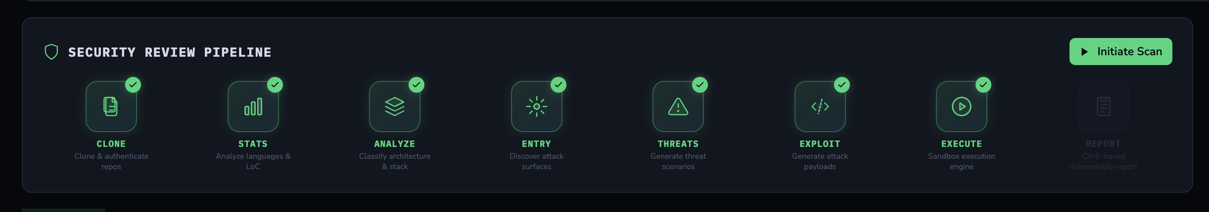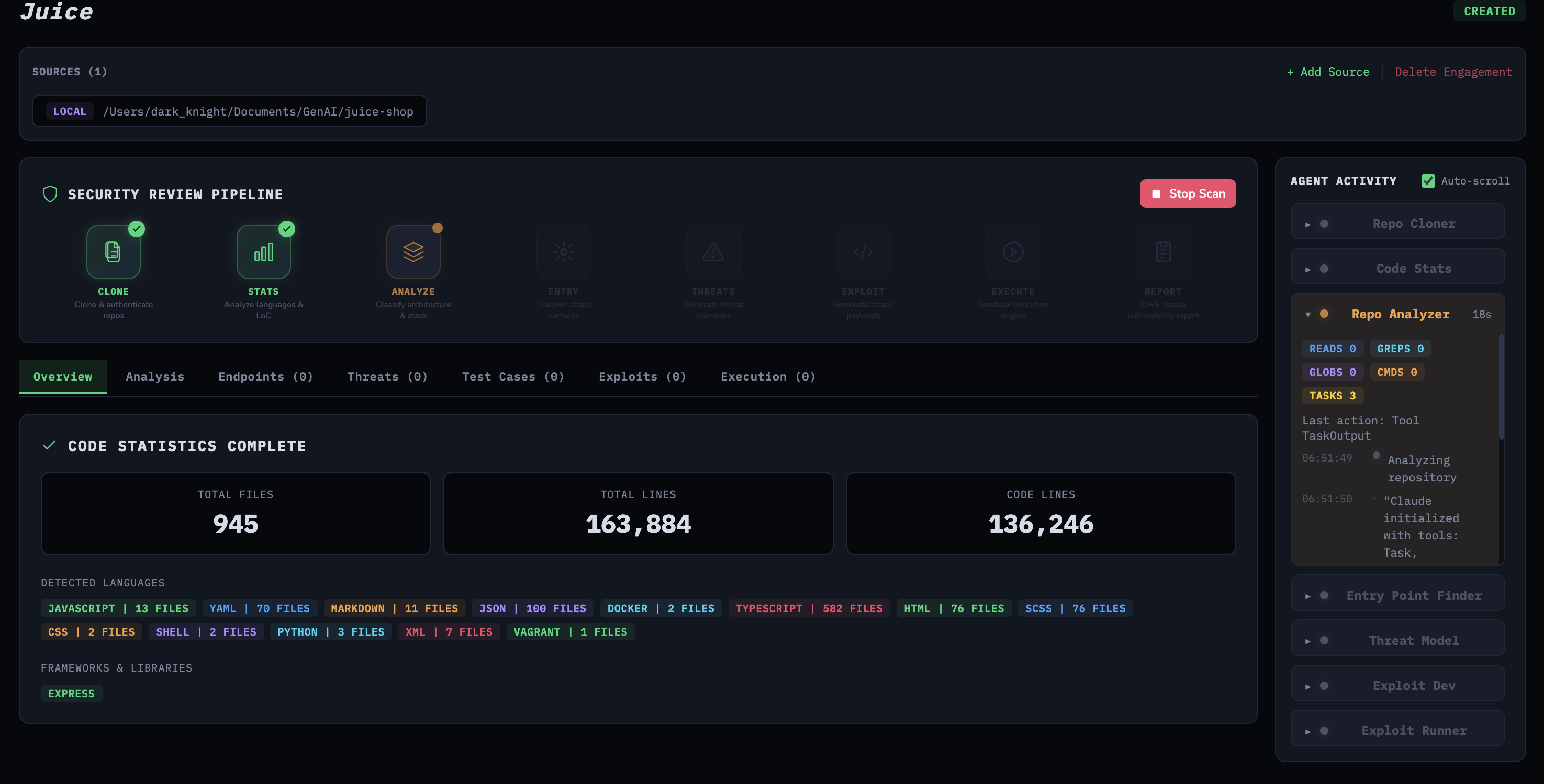 The pipeline then runs seven stages: clone the repository, analyze code statistics, run a repo analyzer agent, find entry points, build a threat model, generate exploits, and execute those exploits against the live target. Each stage’s output is stored in PostgreSQL and available through the UI as the pipeline progresses.
