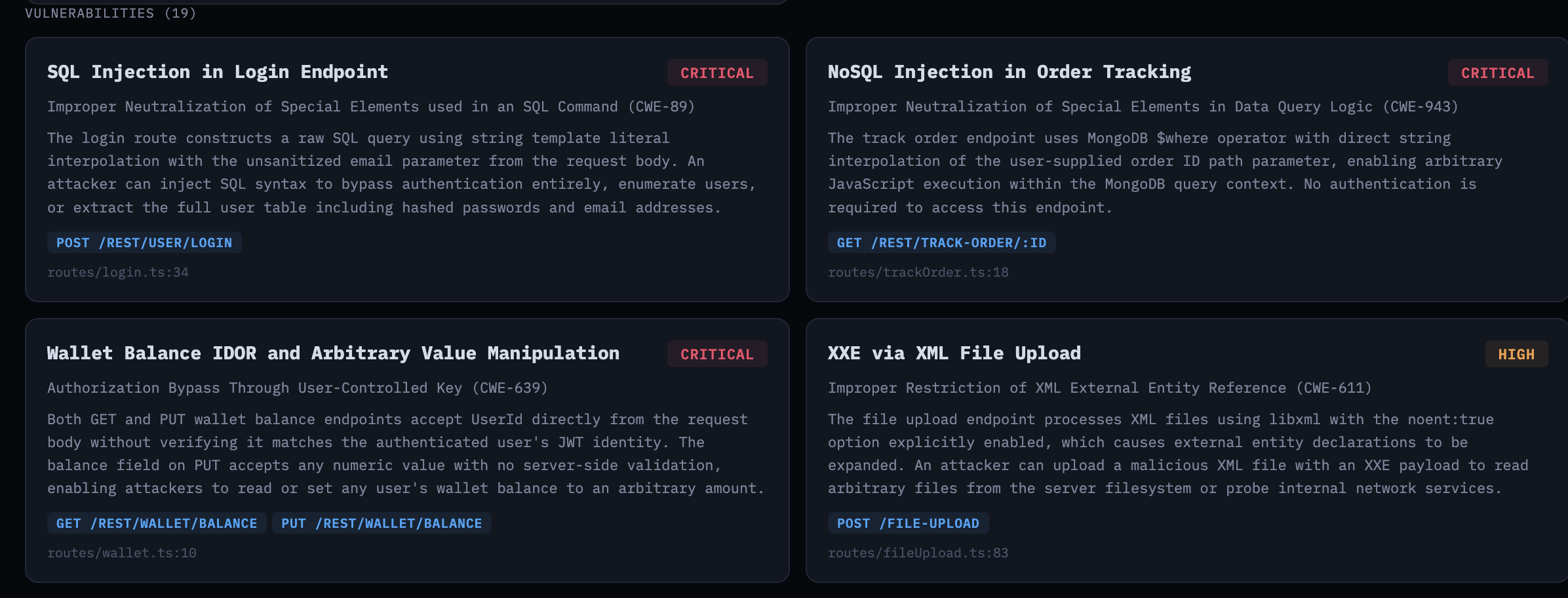 Vulnerabilities tied to specific endpoints and CWE identifiers