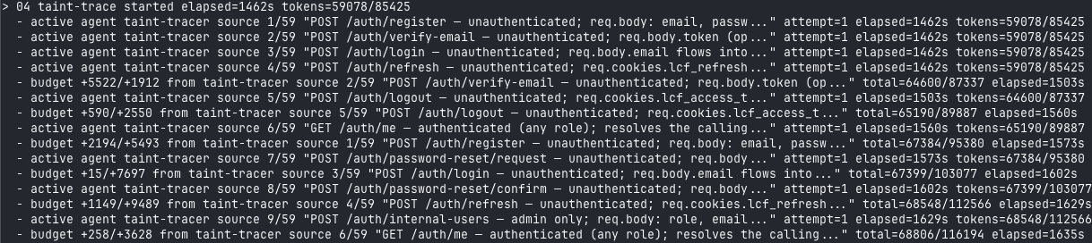 Phase 4 taint-trace fan-out across 59 user-controlled sources. Each source becomes an independent agent invocation with its own token budget.