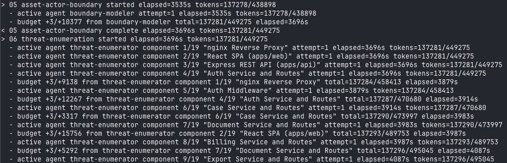 Phase 6 threat-enumeration fan-out across 19 components. The advisor runs once over all candidates and requests bounded reruns where needed.