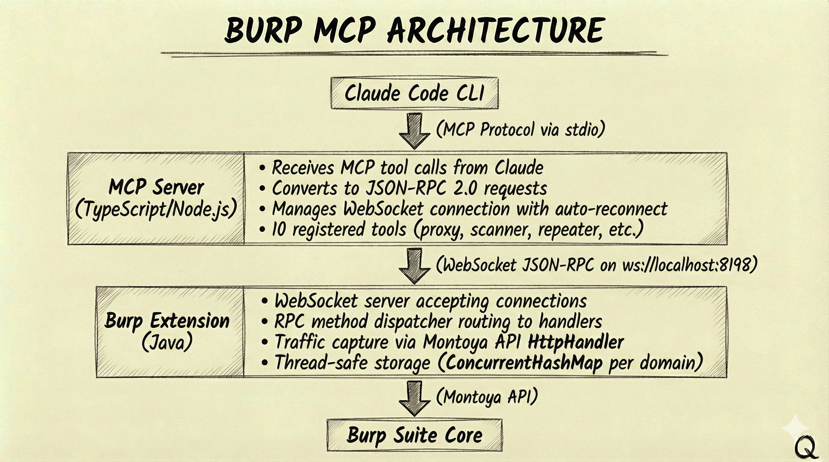 The integration uses a three-tier architecture. Claude Code CLI communicates via the Model Context Protocol (MCP) over stdio to an MCP server written in TypeScript/Node.js. The MCP server converts tool calls to JSON-RPC 2.0 requests and sends them over WebSocket to a Burp extension written in Java. The extension hooks into Burp’s internals via the Montoya API, executing requests and returning results back up the chain.