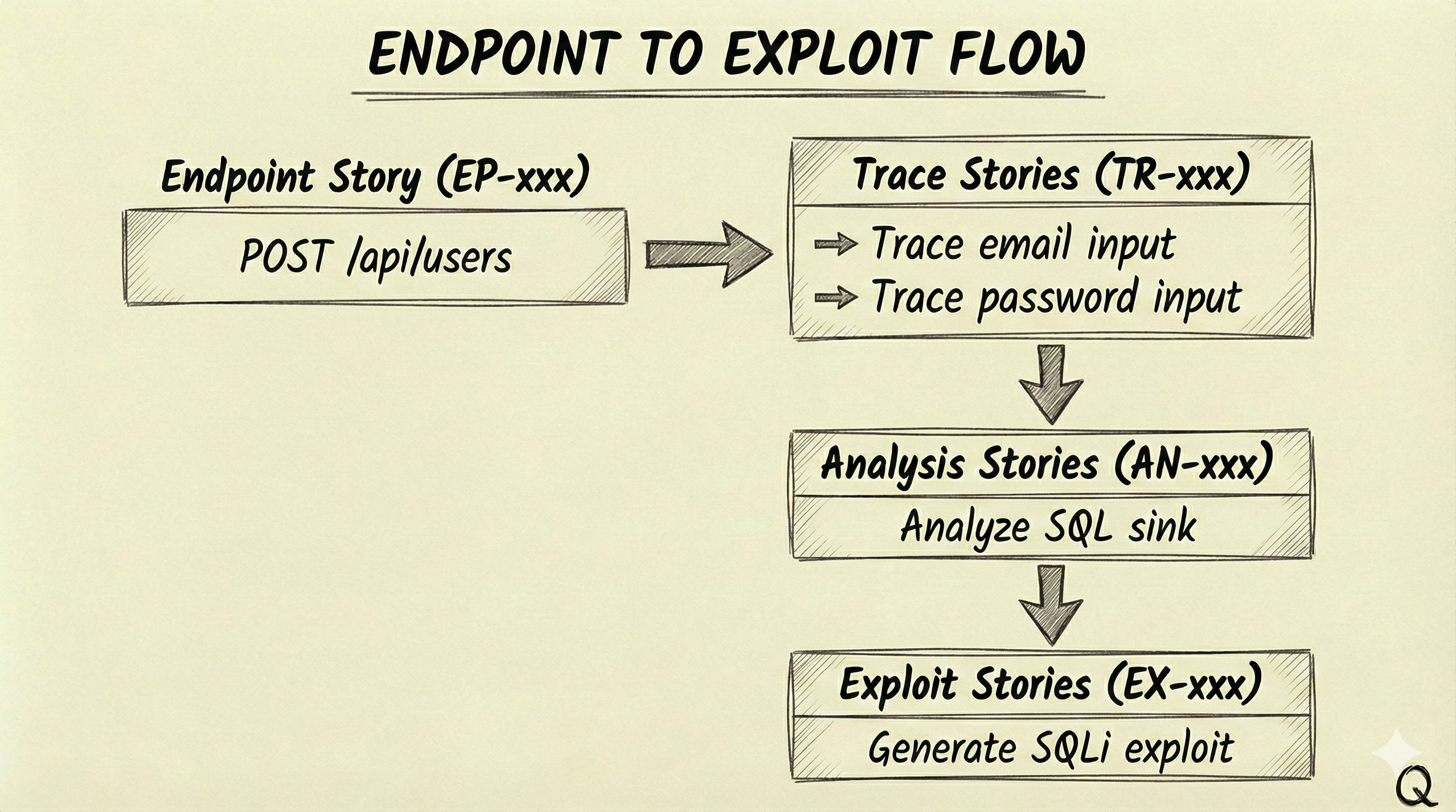 The Build Phase traces user inputs from source to sink. For each endpoint discovered, the agent follows data through function calls, transformations, and database operations to identify dangerous patterns. This is where the story-based model really matters—each endpoint story spawns trace stories for its inputs, which spawn analysis stories when dangerous sinks are found, which spawn exploit stories when vulnerabilities are confirmed: