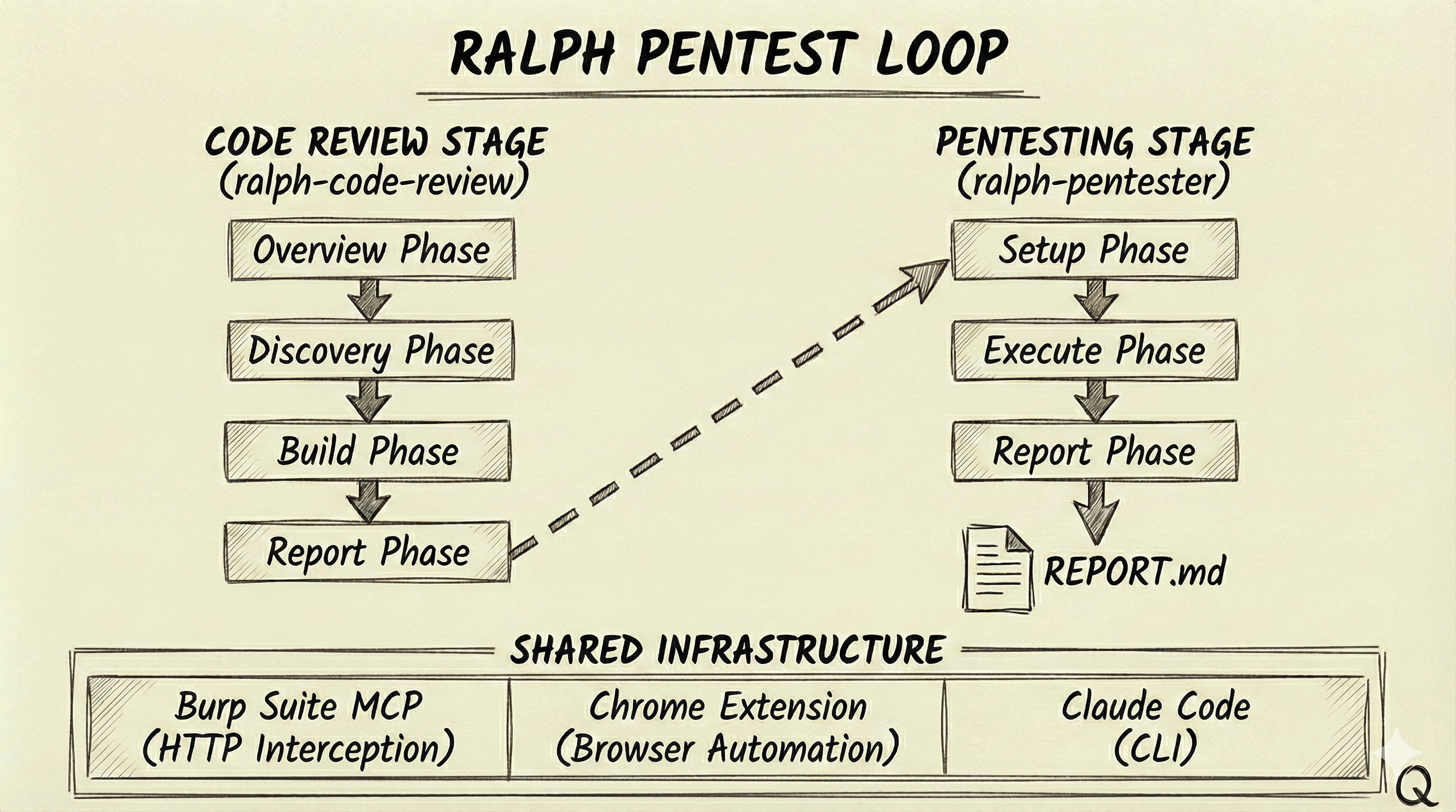 We adapted this pattern for penetration testing. The Ralph Pentest Loop combines static code analysis with dynamic exploit validation in a two-stage pipeline. The first stage reviews source code to identify vulnerabilities and generates a test plan; the second stage executes those tests against a live application using browser automation and an intercepting proxy.